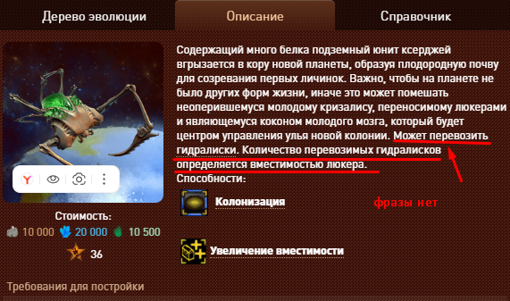 В описании юнит "гигалорд" отсутствует фраза о том , что он может перевозить гидралисков. Хоть юнит и обладает данной способностью.