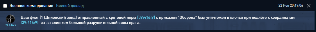 При отправке шпионского зонда миссией "Передислокация" в кротовую нору XAGV [5:635:8] шпионский зонд успешно проходит нору и летит в оборону координат (Конечные координаты: [39:416:9]). Как только шпионский зонд долетает до высокой орбиты приходит сообщение об уничтожении шпионского зонда см. скриншот. При подлете никаких флотов на высокой орбите не было видно
