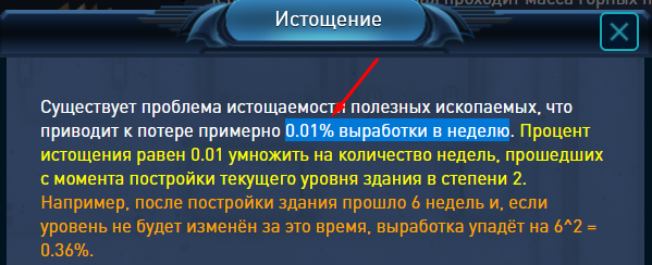 По новой формуле полное истощение наступает примерно через 700 дней. Со временем истощение значительно увеличивается, если шахте больше года. Таким образом истощение растёт по экспоненте, с нарастанием уровня истощения по времени.