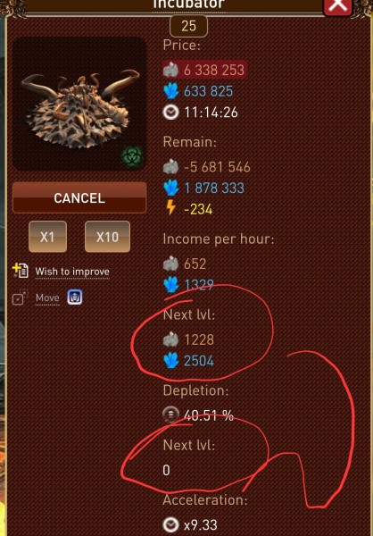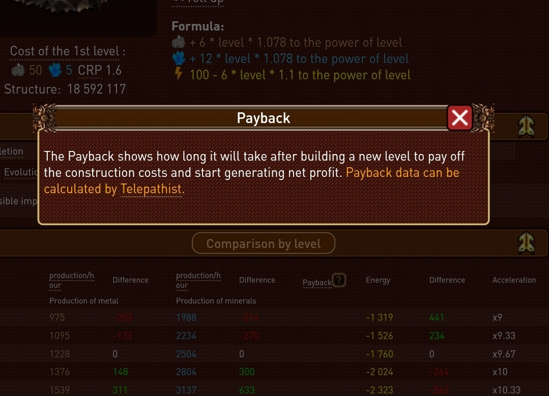 When one goes to upgrade a mine building there is a wrong display of what output will be after thenupgrade is completed. For players who pay real money for premium, return on the investment is also calculated wrongly and displayed as fact.