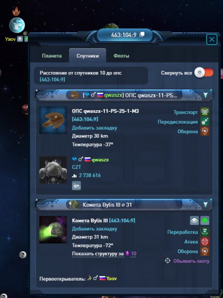 Гравипушка > Направление > Наведение на цель > выбрать комету Bylis III