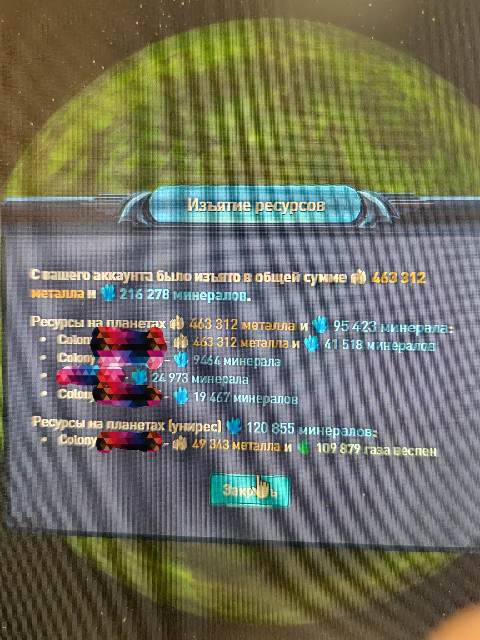 При атаке пиратов и сборе осколков. Выскочило сообщение, что изъяты ресурсы. Подозреваю это связано с началом нового месяца и счетчиком ресурсов, которые можно передать, получить. хорошо что ресурсов было мало. Проблема массовая. Некоторые пишут, что ничего не делали, и сообщение выскочило при заходе в игру.
