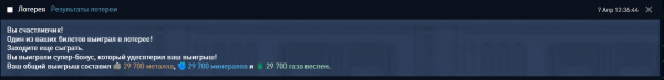 При выигрыше супер-бонуса в лотерее, пишется, что супер-бонус "удесятерил" выигрыш, правильный вариант - утроил (9900 стандартный выигрыш, 29700 - утроенный). Ну или лотерея при супер-бонусе в самом деле по задумке должна была удесятерить выигрыш, и он должен был составить 99000. Кстати говоря, какой шанс выигрыша при покупке 1 билета из 100 доступных? 1%? Очень частно проигрываю, покупая по 80-90 билетов, будто шансы занижены при покупке большого числа билетов